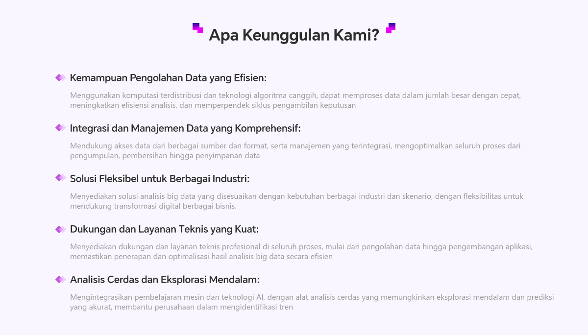Layanan Analisis Big Data Terintegrasi Kami menyediakan solusi analisis big data yang matang, alat analisis big data canggih, dan layanan teknis profesional