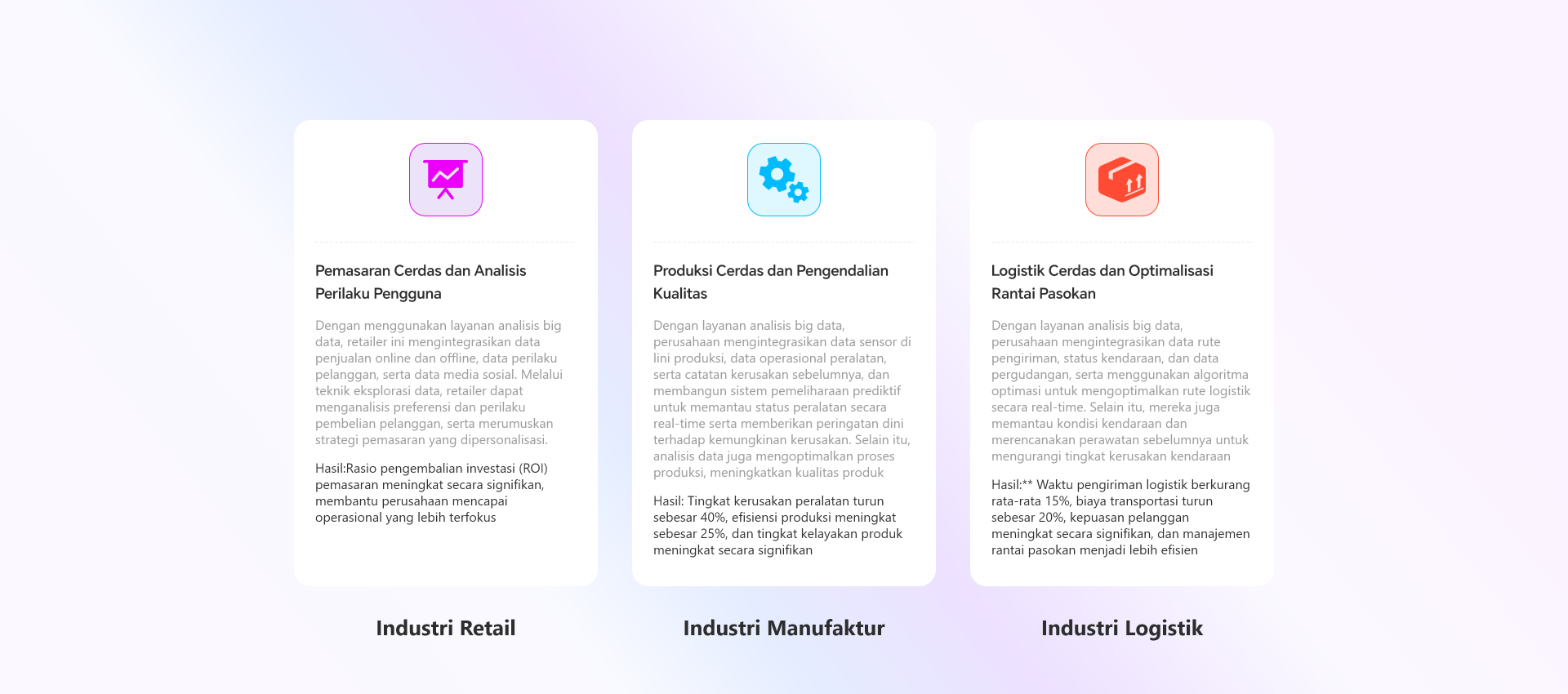 Mencakup seluruh rantai teknologi mulai dari pengolahan big data, analisis, eksplorasi hingga pengembangan dan operasional aplikasi, menyediakan dukungan layanan satu atap